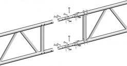 Der Ober- und Untergurt sowie die Endpfosten haben einen Außendurchmesser von 48,3 mm und sind für den Anschluss von Gerüstkupplungen ausgelegt. Durch Verwendung des Auflageriegels, aufgesetzt auf systemfreie Gitterträger kann mit Stellrahmen 0,73 m breit auch im Systemraster weitergebaut werden. Verschiedene Gitterträger können untereinander mit Gitterträger-Verbindern T16 und Gitterträger-Rohrklappstecker oder Spezialschraube M12 x 60 mit Mutter verbunden werden. In Verbindung mit den Gitter- träger-Verbindern T4, gebogen und Seriengitterträgern, 45 cm hoch, aus Aluminium oder Stahl, können sogar Satteldachkonstruktionen mit einer Dachneigung von 11° gebaut werden. Stahl-Gitterträger 750, 75 cm hoch, in Stahlausführung werden zur Abfangung hoher Lasten bzw. Überbrückung größerer Spann- weiten eingesetzt.