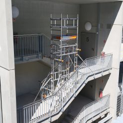 Die Arbeitshöhe liegt zwischen 4,15 m und 6,15 m. Das Aluminiumgerüst besitzt eine Arbeitsfläche von 0,75 m x 1,13 m.