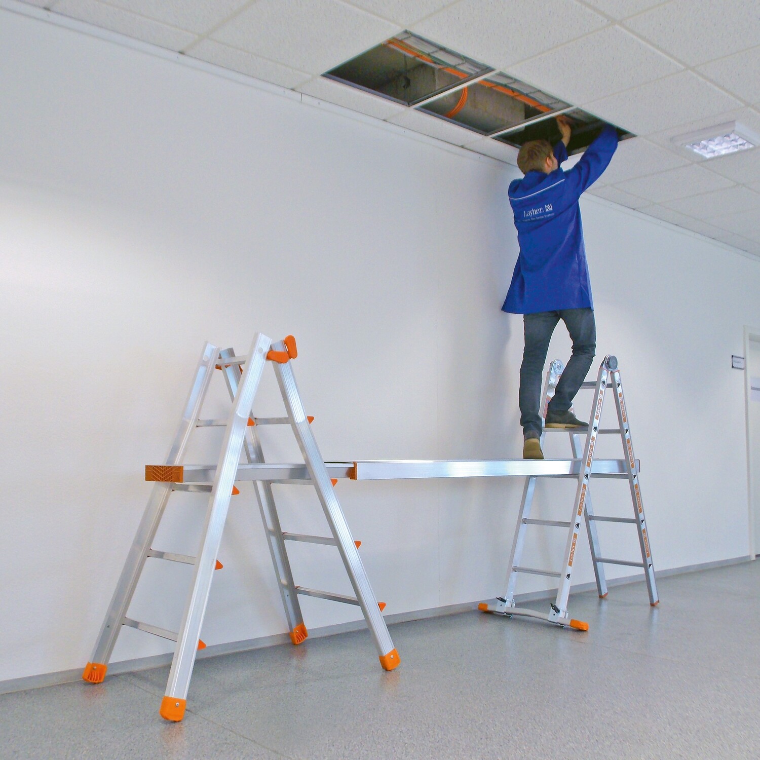 Der ausziehbare Layher Alu-Telesteg ist eine teleskopierbare Arbeitsplatzform für den Einsatz mit Stehleitern.