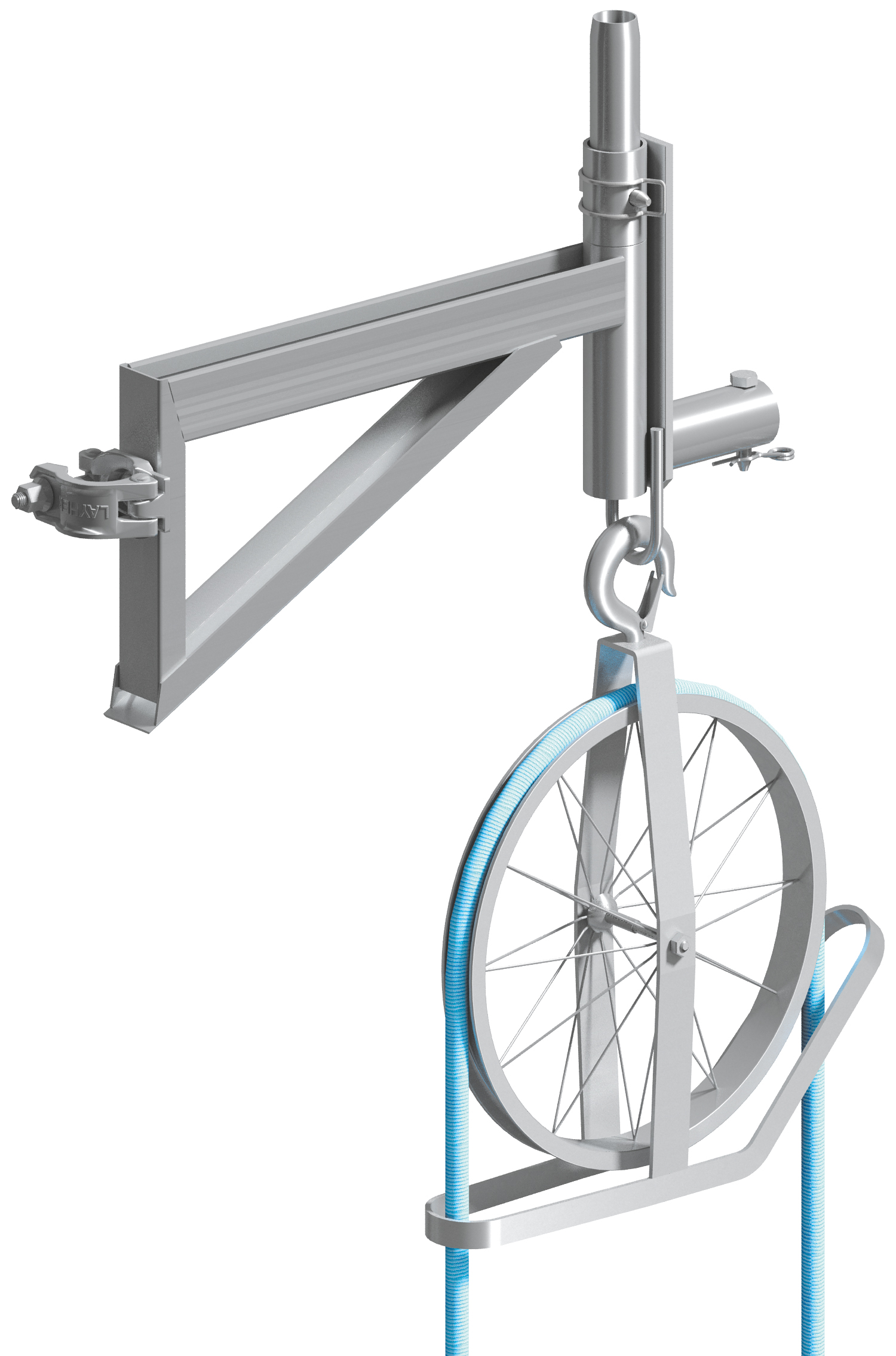 Der Layher Konsoladapter, das Aufzugsrad und Seil sind ein systemfreies Zubehör, das sich für Fassadengerüste und Modulgerüste eignet. Er kommt insbesondere beim Layher Blitz-Gerüst und Layher Allround-Gerüst zum Einsatz.