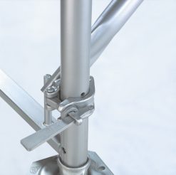 ✅ Aufbau-Tip: Sitzt der Schließbügel der Keil-Halbkupplung der Diagonale genau unter der Lochmarkierung des Stellrahmens, so ist das Gerüstfeld senkrecht ausgerichtet.