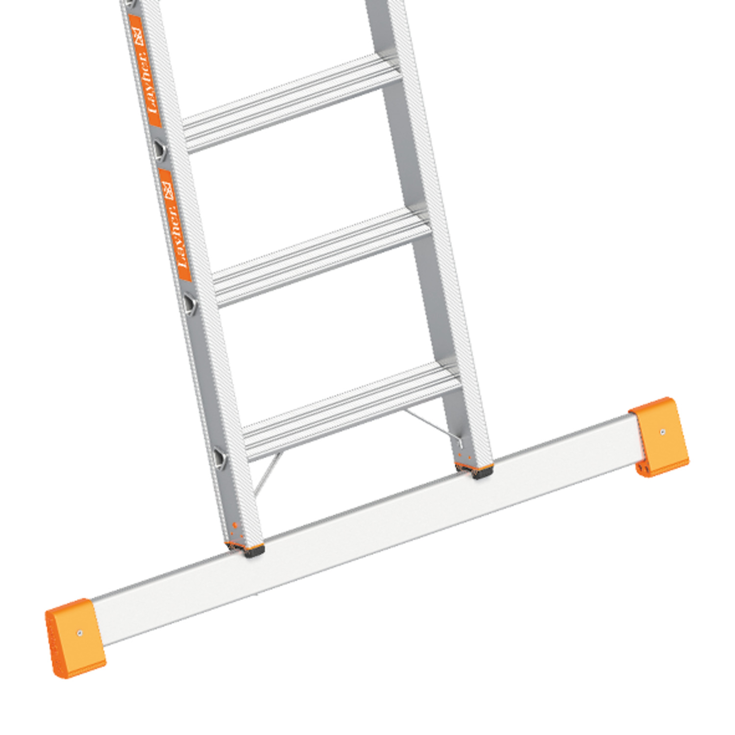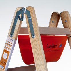 Die klassische Handwerkerleiter. Beidseitig begehbar, mit Werkzeugtasche, Spreizsicherung durch 2 reißfeste Polyester-Gurtbänder, robust konstruierte und verzinkte Stahlscharniere mit Eimerhaken, Transportsicherung aus Holz am Leiterfuß. Holme aus massivem Kiefernholz. Sprossen aus stabilem Buchenholz. Durch die speziellen Vierkantzapfen und ein besonderes Verfahren bei der Verklebung ist eine dauerhaft unlösbare Holm-Stufenverbindung gegeben.