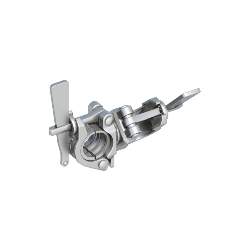 Direkte Anschlussmöglichkeit von Gerüstrohren D=48,3 mm an das Gewinderohr einer Fußspindel in beliebigem Winkel. Mit der Layher Keil-Spindel-Drehkupplung kann man Fußspindeln vor Verrutschen sichern.
