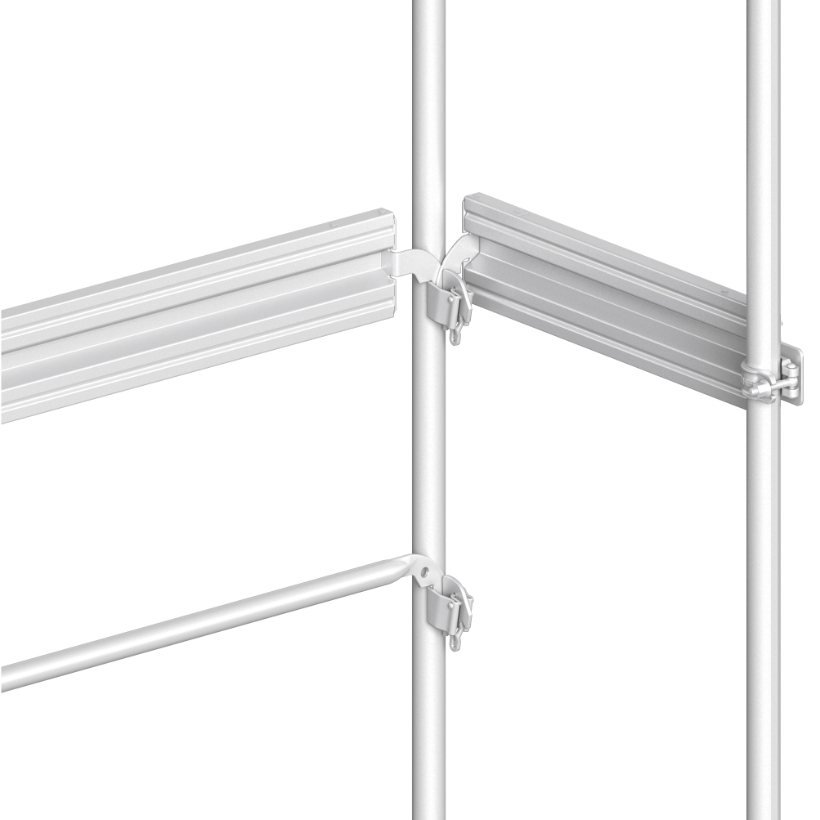 Um die Anforderungen gemäß RSA (Teil A) an die Absicherung von Gerüsten und Fußgängerpassagen zu erfüllen, hat Layher für das Blitz Gerüst schnell montierbare Bauteile aus Stahl mit rot-weißer, reflektierender Folie der Reflexionsklasse RA2 entwickelt. Sie werden einfach in die Geländerkästchen des Blitz Gerüst Stellrahmens eingehängt. Für die stirnseitige Montage sind Portalmarkierungen mit Halbkupplungen erhältlich.