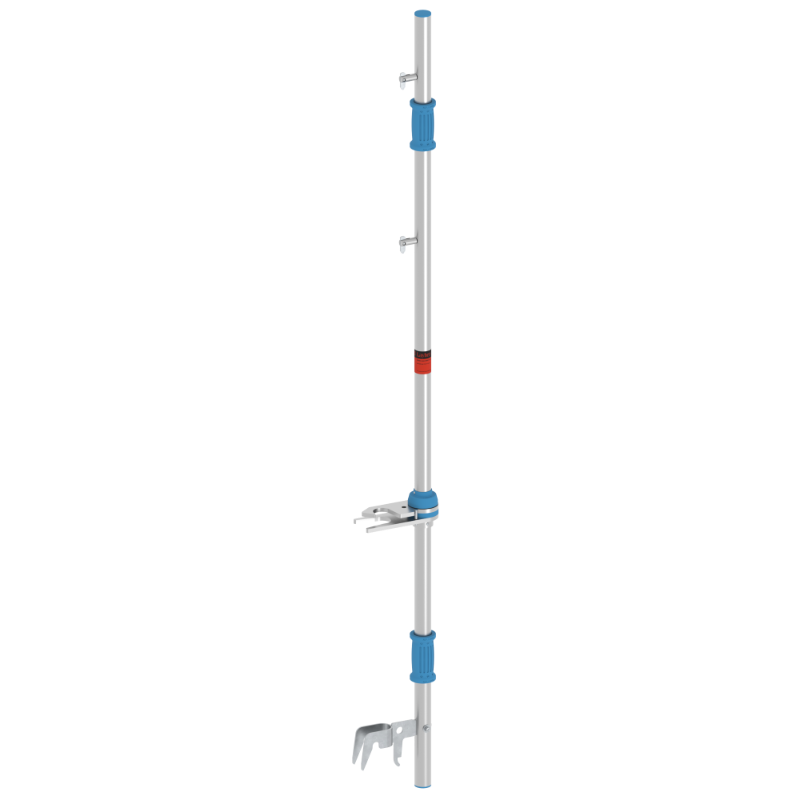 Seit der Neuausgabe der Technischen Regel für Betriebssicherheit TRBS 2121-1 muss nun bei durchgehender Gerüstflucht beim Horizontaltransport auf der jeweils obersten Gerüstlage ein einteiliges Geländer vorhanden sein. Hinzu kommt noch die Forderung, dass beim vertikalen Handtransport von Gerüstteilen ein zweiteiliger Seitenschutz (Handlauf und Knieleiste) vorhanden sein muss. Im Zuge dieser geänderten Anforderungen wurde der Montagepfosten überarbeitet und weiterentwickelt.