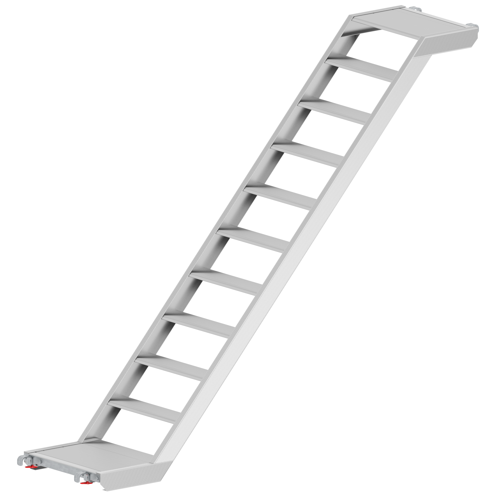 Die O-Komforttreppe basiert auf der bewährten O-Podesttreppe, bietet jedoch 175 mm breite, geriffelte Trittstufen für ein besonders angenehmes Treppensteigen, insbesondere bei großen Höhen. Das verstärkte Wangenprofil minimiert die Durchbiegung, was die Stabilität zusätzlich erhöht. Treppengeländer, Innengeländer und Umlaufgeländer können sowohl an der Podesttreppe als auch an der Komforttreppe angebracht werden.