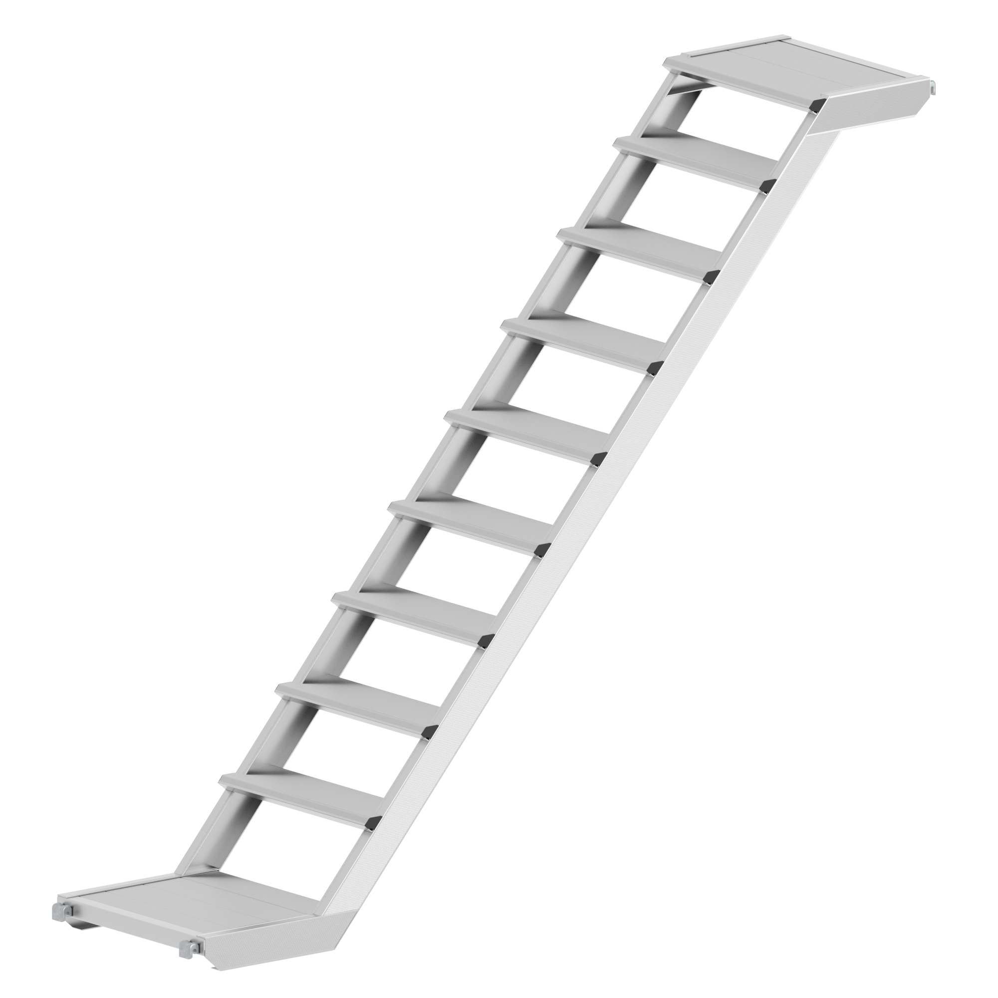 Die O-Komforttreppe basiert auf der bewährten O-Podesttreppe, bietet jedoch 175 mm breite, geriffelte Trittstufen für ein besonders angenehmes Treppensteigen, insbesondere bei großen Höhen. Das verstärkte Wangenprofil minimiert die Durchbiegung, was die Stabilität zusätzlich erhöht. Treppengeländer, Innengeländer und Umlaufgeländer können sowohl an der Podesttreppe als auch an der Komforttreppe angebracht werden.