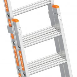 Die Stufenschiebeleiter TOPIC 1032 überzeugt durch ihr verwindungssteifes Holmprofil, das hohe Belastungen bei geringem Gewicht ermöglicht. Sie entspricht der DIN EN 131-1 und verfügt über eine 1130 mm breite Traverse zur Basisverbreiterung für höchste Standsicherheit.