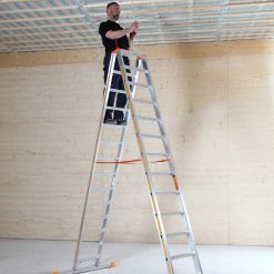 Eine Erweiterung der klassischen Stehleiter mit bequemen breiten Stufen, kunststoffummantelten Stahlscharnieren, Verstärkungswinkel und reißfeste Polyester-Gurtbänder sind Qualitätsmerkmale. Parallel verlaufende Holme. Eine lichte Weite von 390 mm sowie beidseitige Traversen garantieren eine hohe Sicherheit sowie einen komfortablen Aufstieg.