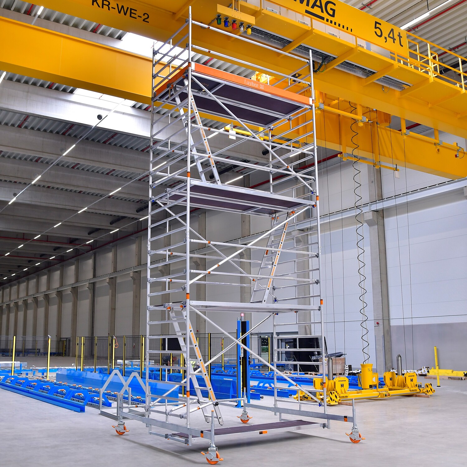 Das Layher Fahrgerüst Uni Breit mit doppelt breitem Arbeitsboden bietet eine großzügige Arbeitsfläche und maximale Bewegungs-freiheit – ideal für Arbeiten mit sperrigem Material in der Höhe. Durch das durchdachte Baukastensystem lassen sich mit wenigen Einzelteilen zahlreiche Aufbauvarianten realisieren, was die Lagerhaltung reduziert und die Logistikkosten senkt. Dank leichter Aluminium-Bauteile und der schnellen Steckmontage steht das Gerüst in kürzester Zeit – für sicheres und effizientes Arbeiten bis zu einer Höhe von fast 14 Metern.